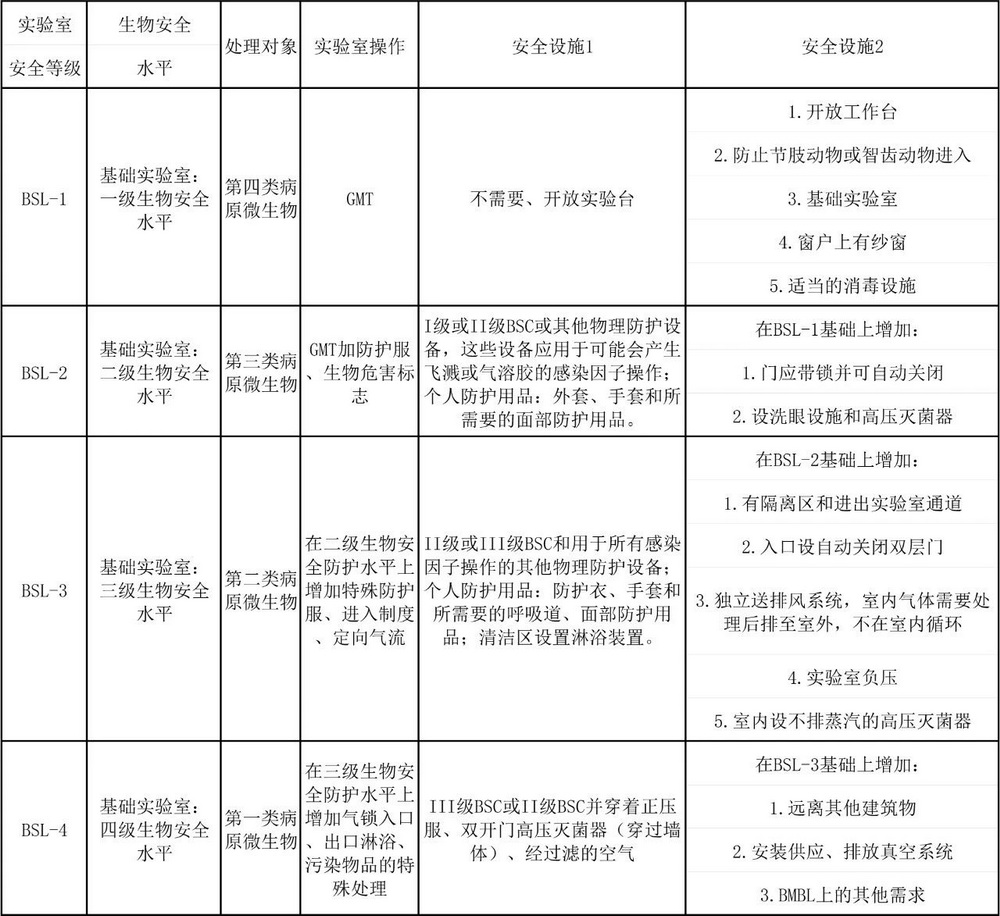表1. 我國生物安全等級實(shí)驗室及安全防護[3]